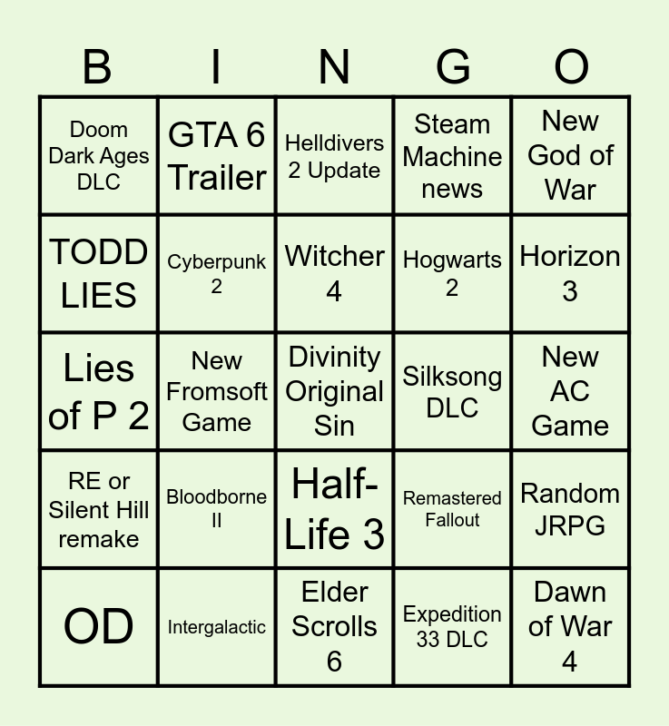 This bingo card has a free space and 24 words: Bloodborne II, Intergalactic, Witcher 4, OD, New God of War, Doom Dark Ages DLC, TODD LIES, GTA 6 Trailer, Silksong DLC, Half-Life 3, Hogwarts 2, Lies of P 2, Remastered Fallout, Random JRPG, Cyberpunk 2, Expedition 33 DLC, New AC Game, Helldivers 2 Update, Horizon 3, New Fromsoft Game, Dawn of War 4, RE or Silent Hill remake, Steam Machine news and Elder Scrolls 6.