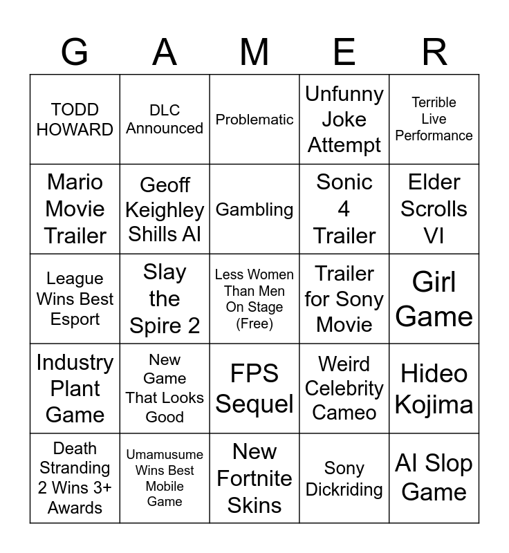 This bingo card has a free space and 29 words: Death Stranding 2 Wins 3+ Awards, Silksong Wins Indie GOTY, Slay the Spire 2, Disappointing Remake Announcement, TODD HOWARD, Problematic, Geoff Keighley Shills AI, New Game That Looks Good, Trailer for Sony Movie, Umamusume Wins Best Mobile Game, Girl Game, AI Slop Game, New Fortnite Skins, Sony Dickriding, Elder Scrolls VI, Valve 3, FPS Sequel, Industry Plant Game, Terrible Live Performance, League Wins Best Esport, Weird Celebrity Cameo, Trailer With No Gameplay, Sonic 4 Trailer, Mario Movie Trailer, Unfunny Joke Attempt, DLC Announced, Hideo Kojima, Gambling and Cringe Acceptance Speech.