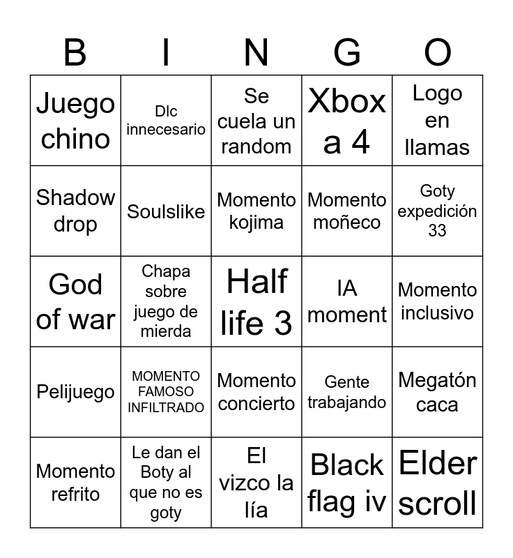 This bingo card has a free space and 24 words: MOMENTO FAMOSO INFILTRADO, Le dan el Boty al que no es goty, Momento kojima, Momento refrito, Logo en llamas, Juego chino, Shadow drop, Dlc innecesario, IA moment, Momento concierto, Momento moñeco, God of war, Gente trabajando, Megatón caca, Soulslike, Black flag iv, Momento inclusivo, Se cuela un random, Goty expedición 33, Chapa sobre juego de mierda, Elder scroll, Pelijuego, Xbox a 4 and El vizco la lía.