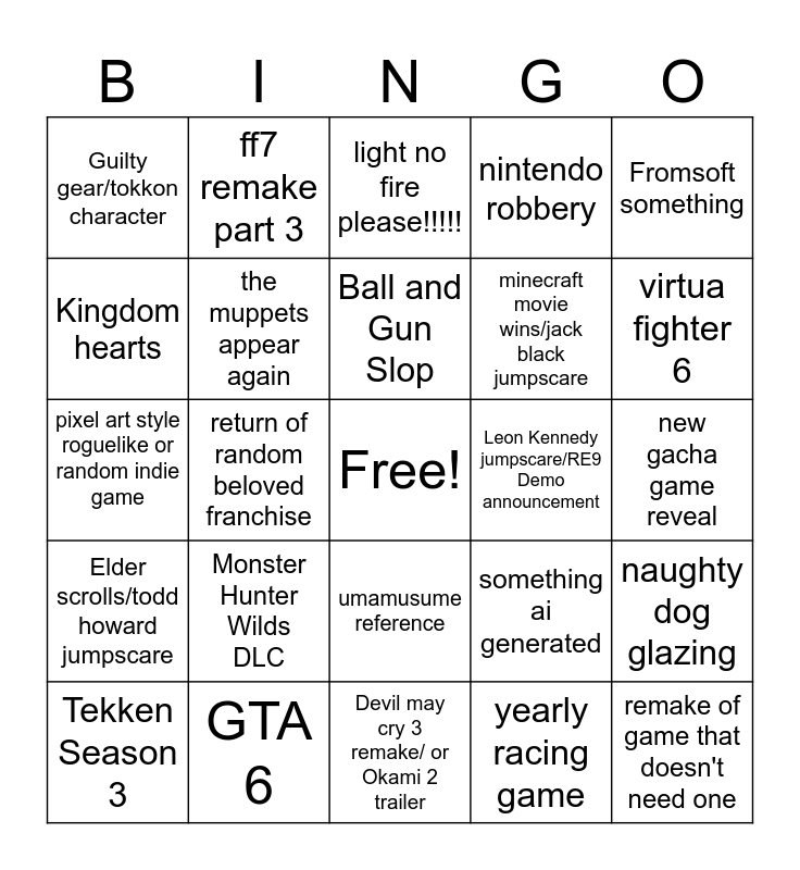 This bingo card has a free space and 24 words: Monster Hunter Wilds DLC, GTA 6, Ball and Gun Slop, Tekken Season 3, Fromsoft something, Guilty gear/tokkon character, Kingdom hearts, ff7 remake part 3, Leon Kennedy jumpscare/RE9 Demo announcement, umamusume reference, minecraft movie wins/jack black jumpscare, pixel art style roguelike or random indie game, something ai generated, naughty dog glazing, the muppets appear again, yearly racing game, new gacha game reveal, light no fire please!!!!!, virtua fighter 6, return of random beloved franchise, remake of game that doesn't need one, Elder scrolls/todd howard jumpscare, nintendo robbery and Devil may cry 3 remake/ or Okami 2 trailer.