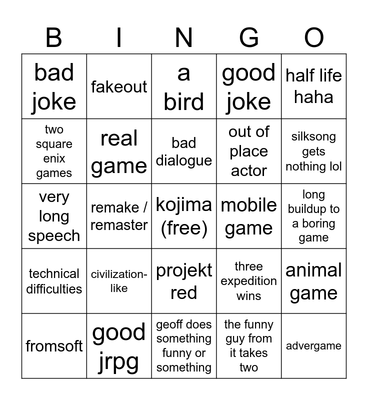 This bingo card has a free space and 24 words: civilization- like, good jrpg, bad dialogue, fromsoft, half life haha, bad joke, two square enix games, fakeout, mobile game, projekt red, out of place actor, very long speech, three expedition wins, animal game, real game, the funny guy from it takes two, long buildup to a boring game, a bird, silksong gets nothing lol, remake / remaster, advergame, technical difficulties, good joke and geoff does something funny or something.