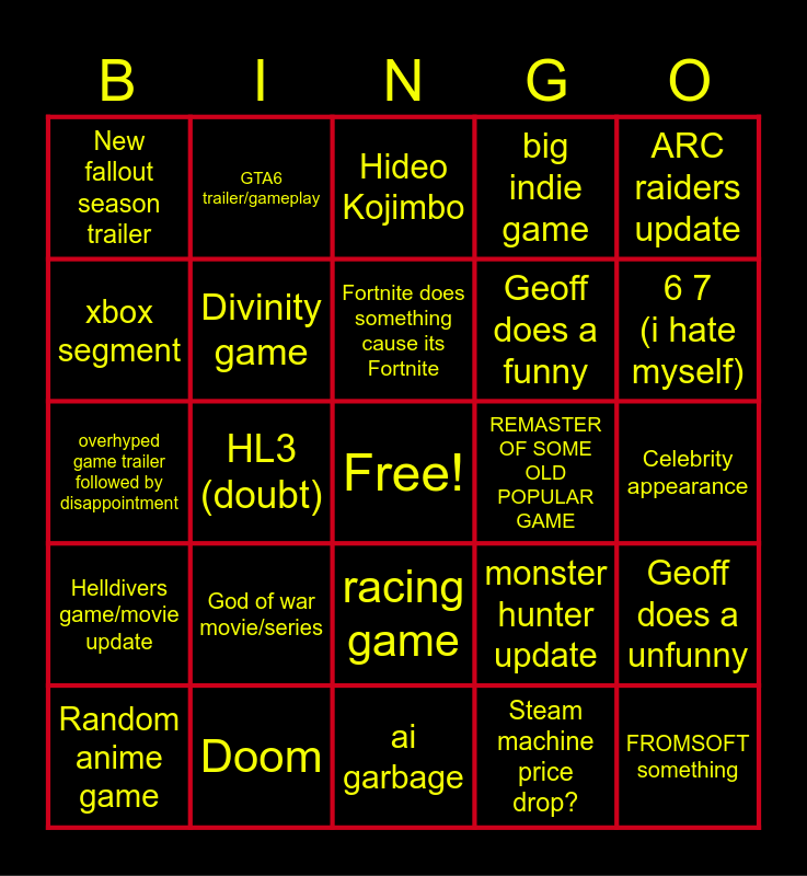 This bingo card has a free space and 24 words: God of war movie/series, Doom, Fortnite does something cause its Fortnite, Random anime game, ARC raiders update, New fallout season trailer, xbox segment, GTA6 trailer/gameplay, REMASTER OF SOME OLD POPULAR GAME, racing game, Geoff does a funny, overhyped game trailer followed by disappointment, monster hunter update, Geoff does a unfunny, Divinity game, Steam machine price drop?, Celebrity appearance, Hideo Kojimbo, 6 7 (i hate myself), HL3 (doubt), FROMSOFT something, Helldivers game/movie update, big indie game and ai garbage.