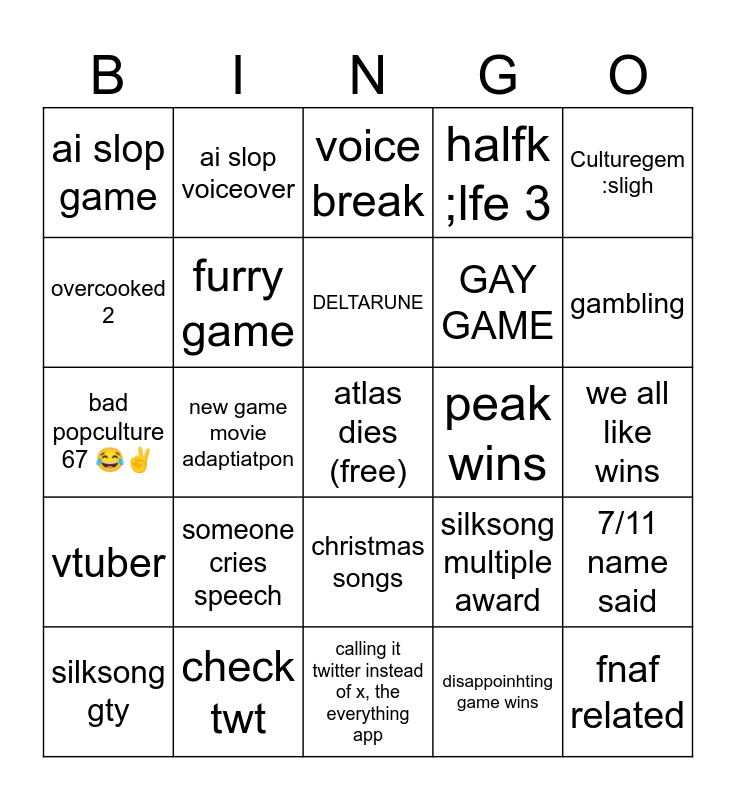 This bingo card has a free space and 24 words: silksong gty, someone cries speech, DELTARUNE, disappoinhting game wins, Culturegem :sligh, ai slop game, ai slop voiceover, voice break, peak wins, we all like wins, bad popculture 67 😂✌, furry game, silksong multiple award, 7/11 name said, overcooked 2, check twt, calling it twitter instead of x, the everything app, halfk ;lfe 3, gambling, vtuber, new game movie adaptiatpon, christmas songs, GAY GAME and fnaf related.