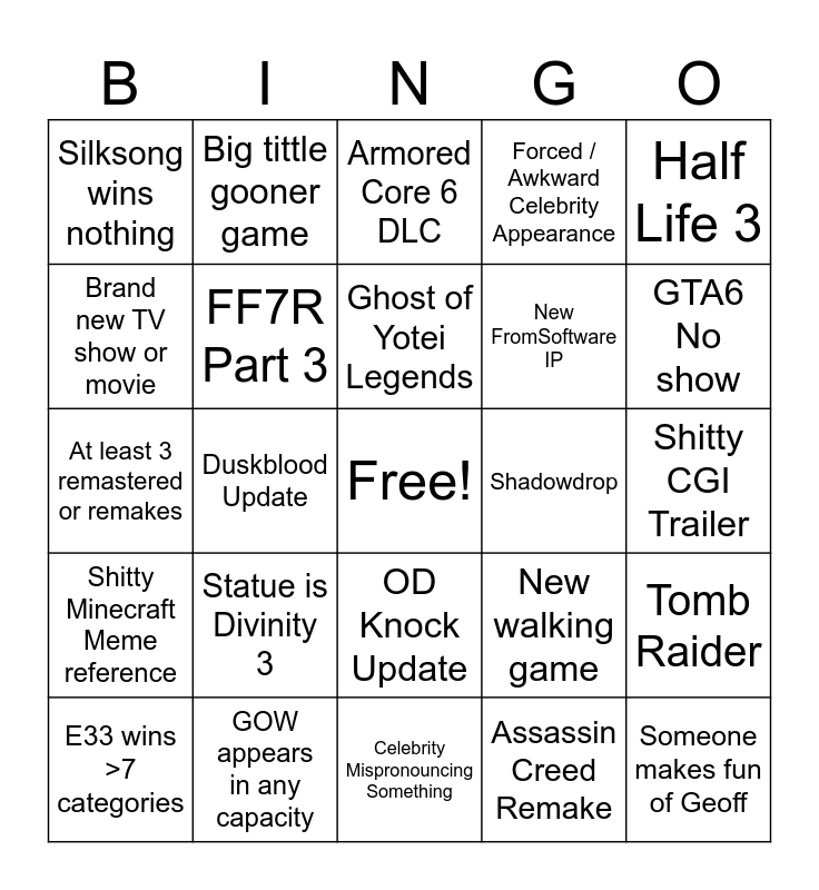 This bingo card has a free space and 24 words: Statue is Divinity 3, GOW appears in any capacity, Ghost of Yotei Legends, E33 wins >7 categories, Half Life 3, Silksong wins nothing, Brand new TV show or movie, Big tittle gooner game, Shadowdrop, OD Knock Update, New FromSoftware IP, At least 3 remastered or remakes, New walking game, Tomb Raider, FF7R Part 3, Assassin Creed Remake, Shitty CGI Trailer, Armored Core 6 DLC, GTA6 No show, Duskblood Update, Someone makes fun of Geoff, Shitty Minecraft Meme reference, Forced / Awkward Celebrity Appearance and Celebrity Mispronouncing Something.