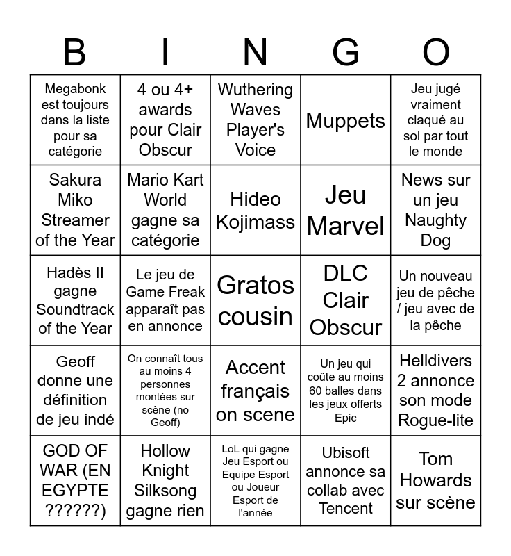 This bingo card has a free space and 24 words: On connaît tous au moins 4 personnes montées sur scène (no Geoff), Hollow Knight Silksong gagne rien, Hideo Kojimass, GOD OF WAR (EN EGYPTE ??????), Jeu jugé vraiment claqué au sol par tout le monde, Megabonk est toujours dans la liste pour sa catégorie, Sakura Miko Streamer of the Year, 4 ou 4+ awards pour Clair Obscur, DLC Clair Obscur, Accent français on scene, Jeu Marvel, Hadès II gagne Soundtrack of the Year, Un jeu qui coûte au moins 60 balles dans les jeux offerts Epic, Helldivers 2 annonce son mode Rogue-lite, Mario Kart World gagne sa catégorie, Ubisoft annonce sa collab avec Tencent, Un nouveau jeu de pêche / jeu avec de la pêche, Wuthering Waves Player's Voice, News sur un jeu Naughty Dog, Le jeu de Game Freak apparaît pas en annonce, Tom Howards sur scène, Geoff donne une définition de jeu indé, Muppets and LoL qui gagne Jeu Esport ou Equipe Esport ou Joueur Esport de l'année.