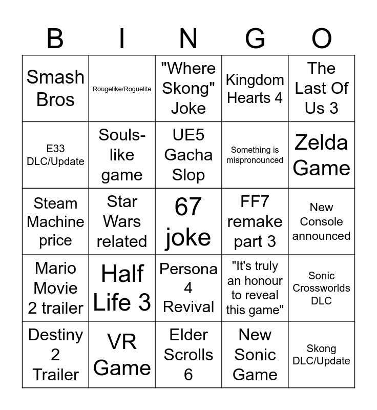 This bingo card has a free space and 24 words: Half Life 3, VR Game, UE5 Gacha Slop, Destiny 2 Trailer, The Last Of Us 3, Smash Bros, E33 DLC/Update, Rougelike/Roguelite, FF7 remake part 3, Persona 4 Revival, Something is mispronounced, Steam Machine price, "It's truly an honour to reveal this game", Sonic Crossworlds DLC, Souls-like game, New Sonic Game, New Console announced, "Where Skong" Joke, Zelda Game, Star Wars related, Skong DLC/Update, Mario Movie 2 trailer, Kingdom Hearts 4 and Elder Scrolls 6.