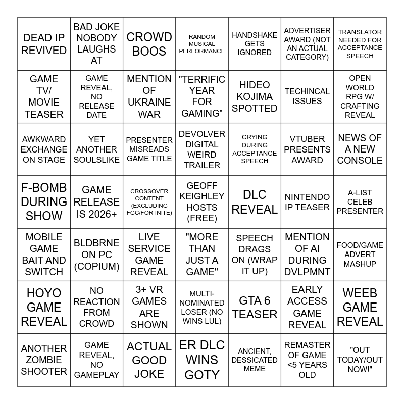 This bingo card has a free space and 48 words: GTA 6 TEASER, TECHINCAL ISSUES, ER DLC WINS GOTY, GAME RELEASE IS 2026+, PRESENTER MISREADS GAME TITLE, A-LIST CELEB PRESENTER, BAD JOKE NOBODY LAUGHS AT, GAME REVEAL, NO GAMEPLAY, ADVERTISER AWARD (NOT AN ACTUAL CATEGORY), "MORE THAN JUST A GAME", TRANSLATOR NEEDED FOR ACCEPTANCE SPEECH, RANDOM MUSICAL PERFORMANCE, VTUBER PRESENTS AWARD, CRYING DURING ACCEPTANCE SPEECH, HOYO GAME REVEAL, NINTENDO IP TEASER, GAME TV/ MOVIE TEASER, OPEN WORLD RPG W/ CRAFTING REVEAL, EARLY ACCESS GAME REVEAL, HANDSHAKE GETS IGNORED, HIDEO KOJIMA SPOTTED, CROSSOVER CONTENT (EXCLUDING FGC/FORTNITE), DEAD IP REVIVED, GAME REVEAL, NO RELEASE DATE, WEEB GAME REVEAL, MENTION OF UKRAINE WAR, NEWS OF A NEW CONSOLE, ANOTHER ZOMBIE SHOOTER, DEVOLVER DIGITAL WEIRD TRAILER, YET ANOTHER SOULSLIKE, REMASTER OF GAME <5 YEARS OLD, DLC REVEAL, FOOD/GAME ADVERT MASHUP, NO REACTION FROM CROWD, F-BOMB DURING SHOW, SPEECH DRAGS ON (WRAP IT UP), MENTION OF AI DURING DVLPMNT, AWKWARD EXCHANGE ON STAGE, LIVE SERVICE GAME REVEAL, 3+ VR GAMES ARE SHOWN, MOBILE GAME BAIT AND SWITCH, "OUT TODAY/OUT NOW!", CROWD BOOS, ACTUAL GOOD JOKE, "TERRIFIC YEAR FOR GAMING", MULTI-NOMINATED LOSER (NO WINS LUL), BLDBRNE ON PC (COPIUM) and ANCIENT, DESSICATED MEME.