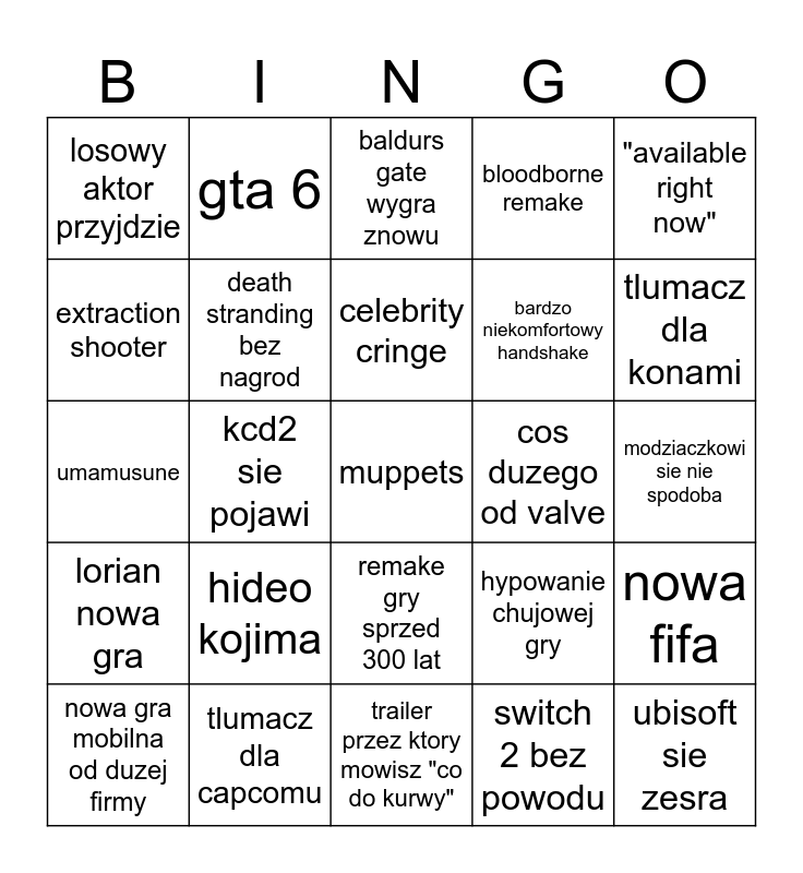 This bingo card has a free space and 24 words: hideo kojima, tlumacz dla capcomu, celebrity cringe, nowa gra mobilna od duzej firmy, "available right now", losowy aktor przyjdzie, extraction shooter, gta 6, cos duzego od valve, remake gry sprzed 300 lat, bardzo niekomfortowy handshake, umamusune, hypowanie chujowej gry, nowa fifa, death stranding bez nagrod, switch 2 bez powodu, modziaczkowi sie nie spodoba, baldurs gate wygra znowu, tlumacz dla konami, kcd2 sie pojawi, ubisoft sie zesra, lorian nowa gra, bloodborne remake and trailer przez ktory mowisz "co do kurwy".