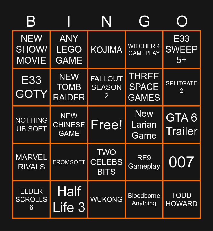 This bingo card has a free space and 24 words: FROMSOFT, Half Life 3, FALLOUT SEASON 2, ELDER SCROLLS 6, E33 SWEEP 5+, NEW SHOW/ MOVIE, E33 GOTY, ANY LEGO GAME, New Larian Game, TWO CELEBS BITS, THREE SPACE GAMES, NOTHING UBISOFT, RE9 Gameplay, 007, NEW TOMB RAIDER, Bloodborne Anything, GTA 6 Trailer, KOJIMA, SPLITGATE 2, NEW CHINESE GAME, TODD HOWARD, MARVEL RIVALS, WITCHER 4 GAMEPLAY and WUKONG.