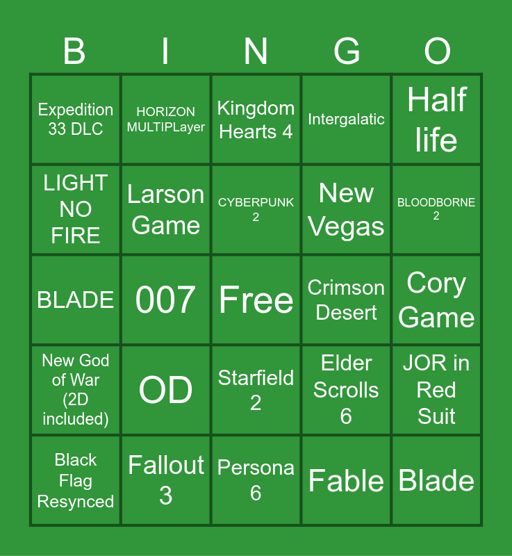This bingo card has a free space and 24 words: OD, Fallout 3, CYBERPUNK 2, Black Flag Resynced, Half life, Expedition 33 DLC, LIGHT NO FIRE, HORIZON MULTIPLayer, Crimson Desert, Starfield 2, New Vegas, BLADE, Elder Scrolls 6, JOR in Red Suit, Larson Game, Fable, Cory Game, Kingdom Hearts 4, BLOODBORNE 2, 007, Blade, New God of War (2D included), Intergalatic and Persona 6.
