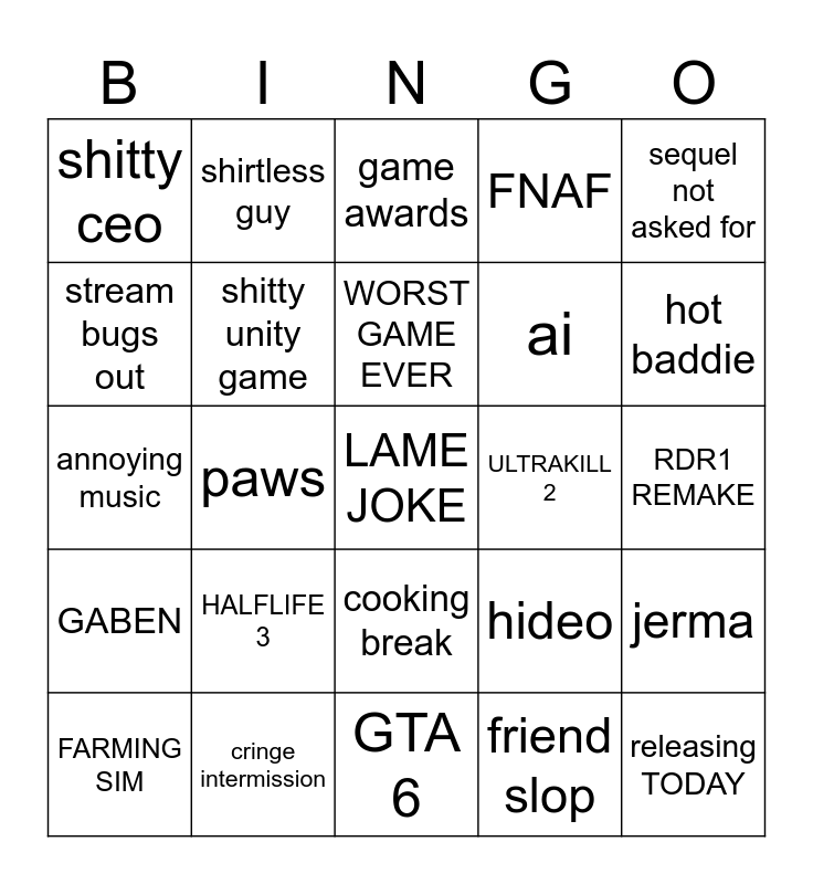 This bingo card has a free space and 24 words: HALFLIFE 3, cringe intermission, WORST GAME EVER, FARMING SIM, sequel not asked for, shitty ceo, stream bugs out, shirtless guy, ULTRAKILL 2, cooking break, ai, annoying music, hideo, jerma, shitty unity game, friend slop, RDR1 REMAKE, game awards, hot baddie, paws, releasing TODAY, GABEN, FNAF and GTA 6.