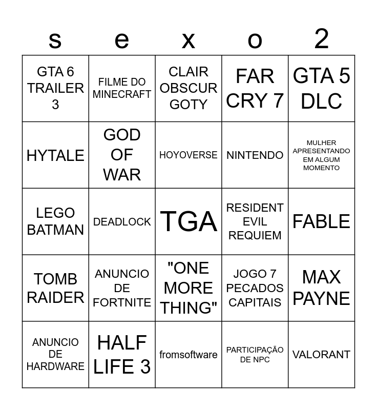 This bingo card has a free space and 24 words: ANUNCIO DE FORTNITE, HALF LIFE 3, HOYOVERSE, ANUNCIO DE HARDWARE, GTA 5 DLC, GTA 6 TRAILER 3, HYTALE, FILME DO MINECRAFT, RESIDENT EVIL REQUIEM, "ONE MORE THING", NINTENDO, LEGO BATMAN, JOGO 7 PECADOS CAPITAIS, MAX PAYNE, GOD OF WAR, PARTICIPAÇÃO DE NPC, FABLE, CLAIR OBSCUR GOTY, MULHER APRESENTANDO EM ALGUM MOMENTO, DEADLOCK, VALORANT, TOMB RAIDER, FAR CRY 7 and fromsoftware.