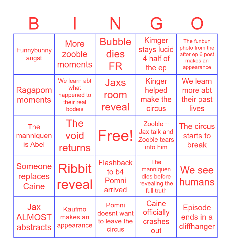 This bingo card has a free space and 24 words: Ribbit reveal, Kaufmo makes an appearance, Jaxs room reveal, Jax ALMOST abstracts, The funbun photo from the after ep 6 post makes an appearance, Funnybunny angst, Ragapom moments, More zooble moments, Zooble + Jax talk and Zooble tears into him, Flashback to b4 Pomni arrived, Kinger helped make the circus, The manniquen is Abel, The manniquen dies before revealing the full truth, We see humans, We learn abt what happened to their real bodies, Caine officially crashes out, The circus starts to break, Bubble dies FR, We learn more abt their past lives, The void returns, Episode ends in a cliffhanger, Someone replaces Caine, Kimger stays lucid 4 half of the ep and Pomni doesnt want to leave the circus.