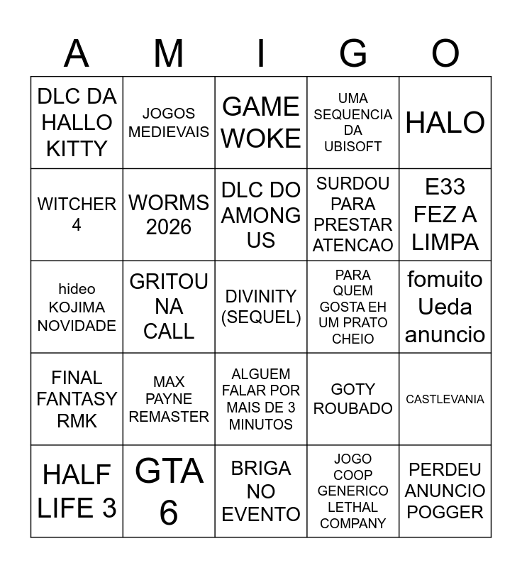 This bingo card has a free space and 24 words: MAX PAYNE REMASTER, GTA 6, DLC DO AMONG US, HALF LIFE 3, HALO, DLC DA HALLO KITTY, WITCHER 4, JOGOS MEDIEVAIS, PARA QUEM GOSTA EH UM PRATO CHEIO, ALGUEM FALAR POR MAIS DE 3 MINUTOS, SURDOU PARA PRESTAR ATENCAO, hideo KOJIMA NOVIDADE, GOTY ROUBADO, CASTLEVANIA, WORMS 2026, JOGO COOP GENERICO LETHAL COMPANY, fomuito Ueda anuncio, GAME WOKE, E33 FEZ A LIMPA, GRITOU NA CALL, PERDEU ANUNCIO POGGER, FINAL FANTASY RMK, UMA SEQUENCIA DA UBISOFT and BRIGA NO EVENTO.