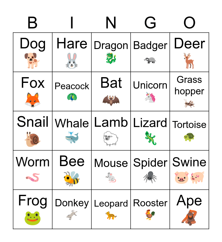 This bingo card has a free space and 24 words: Bee 🐝, Donkey 🫏, Bat 🦇, Frog 🐸, Deer 🦌, Dog 🐕, Fox 🦊, Hare 🐰, Lizard 🦎, Mouse 🐁, Unicorn 🦄, Snail 🐌, Spider 🕷️, Swine 🐷🐖, Peacock 🦚, Rooster 🐓, Tortoise 🐢, Dragon 🐉, Grass hopper 🦗, Whale 🐳, Ape 🦧, Worm 🪱, Badger 🦡 and Leopard 🐆.