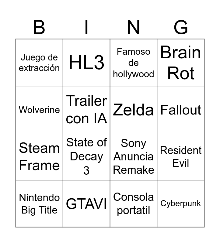 This bingo card has 16 words: GTAVI, Resident Evil, Famoso de hollywood, Juego de extracción, Steam Frame, HL3, Sony Anuncia Remake, Consola portatil, Wolverine, Trailer con IA, Nintendo Big Title, Brain Rot, State of Decay 3, Fallout, Zelda and Cyberpunk.