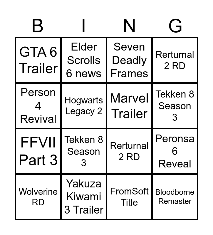This bingo card has 19 words: Rerturnal 2 RD, Half Life 3, Seven Deadly Frames, Bloodborne Remaster, Peronsa 6 Reveal, Person 4 Revival, FromSoft Title, GTA 6 Trailer, Elder Scrolls 6 news, FFVII Part 3, Tekken 8 Season 3, Hogwarts Legacy 2, Marvel Trailer, Yakuza Kiwami 3 Trailer, Wolverine RD, New Sony IP, Rerturnal 2 RD, Tekken 8 Season 3 and Persona 4 Revival.