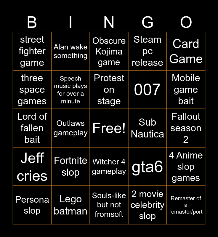 This bingo card has a free space and 24 words: Fortnite slop, Lego batman, Protest on stage, Persona slop, Card Game, street fighter game, three space games, Alan wake something, Sub Nautica, Witcher 4 gameplay, 007, Lord of fallen bait, gta6, 4 Anime slop games, Speech music plays for over a minute, 2 movie celebrity slop, Fallout season 2, Obscure Kojima game, Mobile game bait, Outlaws gameplay, Remaster of a remaster/port, Jeff cries, Steam pc release and Souls-like but not fromsoft.