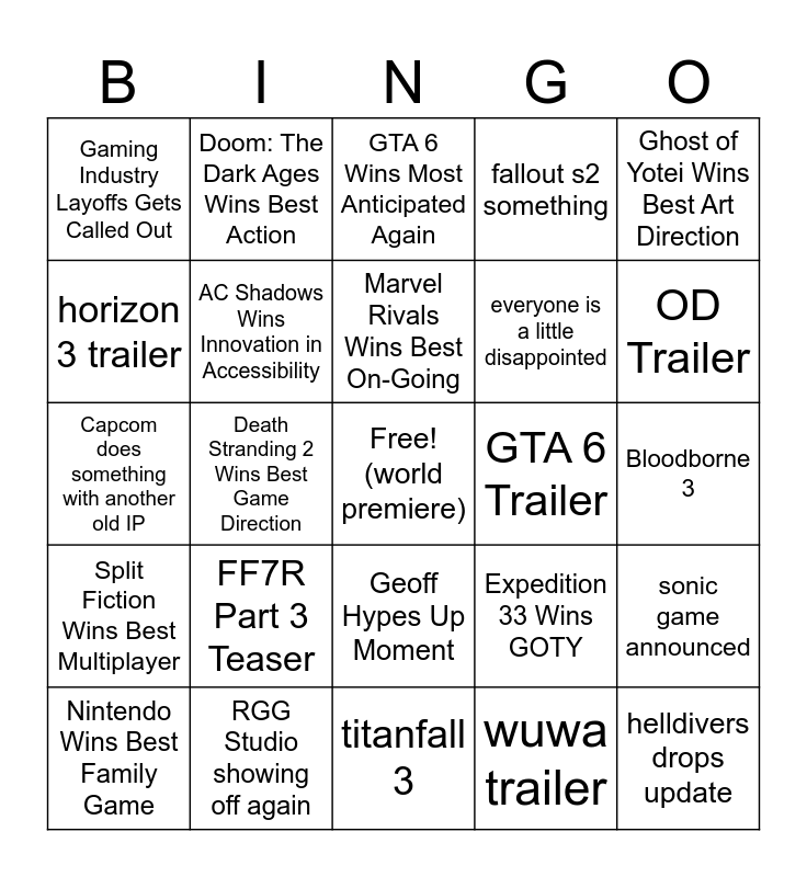 This bingo card has a free space and 33 words: The Hundred Line Wins Best Narrative, Expedition 33 Wins Best RPG, Death Stranding 2 Wins Best Game Direction, Lost Records Wins Games for Impact, Split Fiction Wins Best Multiplayer, AC Shadows Wins Innovation in Accessibility, Ghost of Yotei Wins Best Art Direction, Nintendo Wins Best Family Game, Doom: The Dark Ages Wins Best Action, Ben Starr Wins Best Performance, Marvel Rivals Wins Best On-Going, GTA 6 Wins Most Anticipated Again, Sonic Racing: CrossWorlds Wins Best Racing, TLOU S2 Wins Best Adaptation, GTA 6 Trailer, OD Trailer, RGG Studio showing off again, Capcom does something with another old IP, FF7R Part 3 Teaser, Expedition 33 Wins GOTY, Geoff Hypes Up Moment, Geoff trolls using Sid: The Science Kid, Gaming Industry Layoffs Gets Called Out, Bloodborne 3, titanfall 3, helldivers drops update, fallout s2 something, everyone is a little disappointed, horizon 3 trailer, sonic game announced, ananta trailer, wuwa trailer and celeb is confused what’s going on.