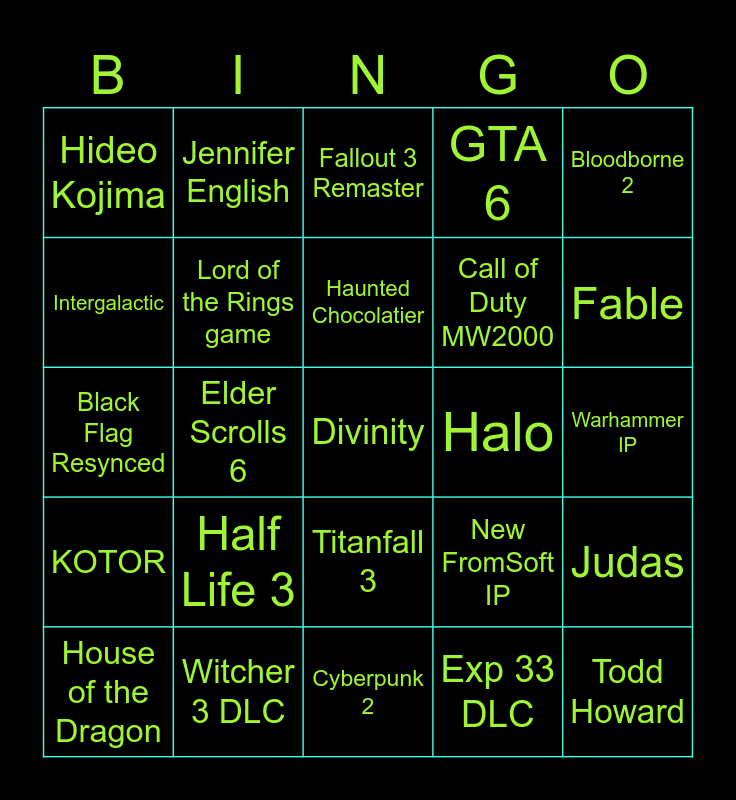 This bingo card has a free space and 24 words: Half Life 3, Witcher 3 DLC, Haunted Chocolatier, House of the Dragon, Bloodborne 2, Hideo Kojima, Intergalactic, Jennifer English, Halo, Titanfall 3, Call of Duty MW2000, Black Flag Resynced, New FromSoft IP, Judas, Lord of the Rings game, Exp 33 DLC, Warhammer IP, Fallout 3 Remaster, Fable, Elder Scrolls 6, Todd Howard, KOTOR, GTA 6 and Cyberpunk 2.