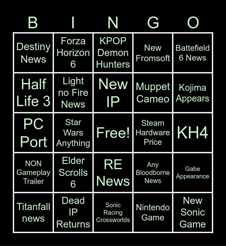 This bingo card has a free space and 24 words: Elder Scrolls 6, Dead IP Returns, New IP, Titanfall news, Battefield 6 News, Destiny News, Half Life 3, Forza Horizon 6, Steam Hardware Price, RE News, Muppet Cameo, PC Port, Any Bloodborne News, Gabe Appearance, Light no Fire News, Nintendo Game, KH4, KPOP Demon Hunters, Kojima Appears, Star Wars Anything, New Sonic Game, NON Gameplay Trailer, New Fromsoft and Sonic Racing Crossworlds.