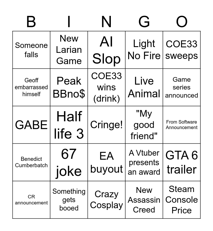 This bingo card has a free space and 24 words: 67 joke, Something gets booed, COE33 wins (drink), CR announcement, COE33 sweeps, Someone falls, Geoff embarrassed himself, New Larian Game, "My good friend", EA buyout, Live Animal, GABE, A Vtuber presents an award, GTA 6 trailer, Peak BBno$, New Assassin Creed, From Software Announcement, AI Slop, Game series announced, Half life 3, Steam Console Price, Benedict Cumberbatch, Light No Fire and Crazy Cosplay.