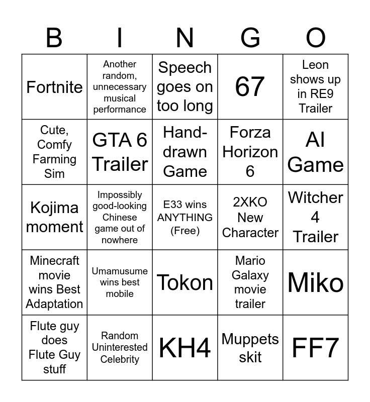 This bingo card has a free space and 24 words: Umamusume wins best mobile, Random Uninterested Celebrity, Hand-drawn Game, Flute guy does Flute Guy stuff, Leon shows up in RE9 Trailer, Fortnite, Cute, Comfy Farming Sim, Another random, unnecessary musical performance, 2XKO New Character, Tokon, Forza Horizon 6, Kojima moment, Mario Galaxy movie trailer, Miko, GTA 6 Trailer, Muppets skit, Witcher 4 Trailer, Speech goes on too long, AI Game, Impossibly good-looking Chinese game out of nowhere, FF7, Minecraft movie wins Best Adaptation, 67 and KH4.