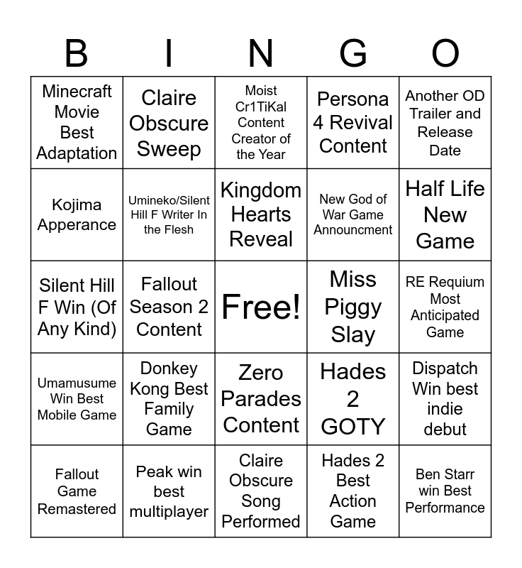 This bingo card has a free space and 24 words: Donkey Kong Best Family Game, Peak win best multiplayer, Kingdom Hearts Reveal, Fallout Game Remastered, Another OD Trailer and Release Date, Minecraft Movie Best Adaptation, Kojima Apperance, Claire Obscure Sweep, Miss Piggy Slay, Zero Parades Content, New God of War Game Announcment, Silent Hill F Win (Of Any Kind), Hades 2 GOTY, Dispatch Win best indie debut, Umineko/Silent Hill F Writer In the Flesh, Hades 2 Best Action Game, RE Requium Most Anticipated Game, Moist Cr1TiKal Content Creator of the Year, Half Life New Game, Fallout Season 2 Content, Ben Starr win Best Performance, Umamusume Win Best Mobile Game, Persona 4 Revival Content and Claire Obscure Song Performed.