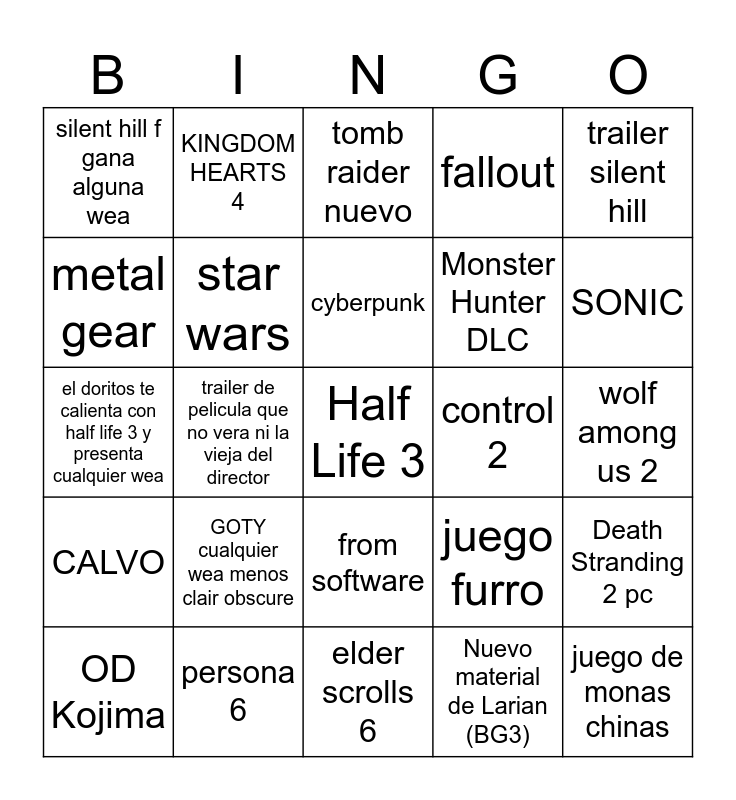 This bingo card has a free space and 24 words: GOTY cualquier wea menos clair obscure, persona 6, cyberpunk, OD Kojima, trailer silent hill, silent hill f gana alguna wea, metal gear, KINGDOM HEARTS 4, control 2, from software, Monster Hunter DLC, el doritos te calienta con half life 3 y presenta cualquier wea, juego furro, Death Stranding 2 pc, star wars, Nuevo material de Larian (BG3), wolf among us 2, tomb raider nuevo, SONIC, trailer de pelicula que no vera ni la vieja del director, juego de monas chinas, CALVO, fallout and elder scrolls 6.