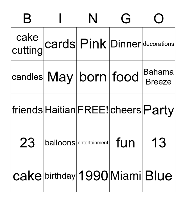 This bingo card has a free space and 24 words: balloons, birthday, born, cake, decorations, cake cutting, candles, cards, cheers, entertainment, food, friends, fun, 13, May, Miami, Party, Pink, Bahama Breeze, Haitian, Blue, 23, Dinner and 1990.
