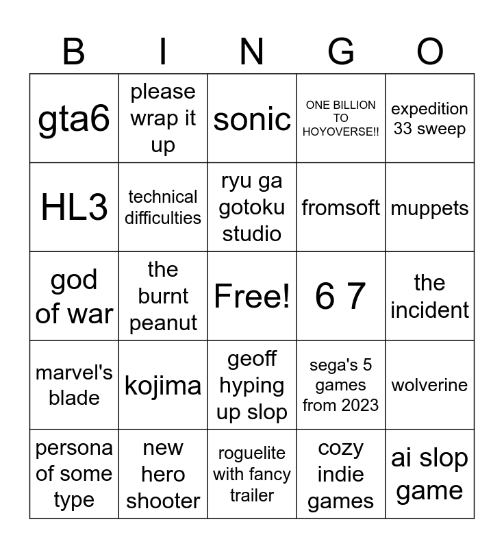 This bingo card has a free space and 24 words: persona of some type, kojima, ryu ga gotoku studio, cozy indie games, expedition 33 sweep, gta6, please wrap it up, sonic, 6 7, the incident, god of war, technical difficulties, sega's 5 games from 2023, wolverine, HL3, new hero shooter, roguelite with fancy trailer, ONE BILLION TO HOYOVERSE!!, muppets, marvel's blade, the burnt peanut, geoff hyping up slop, fromsoft and ai slop game.