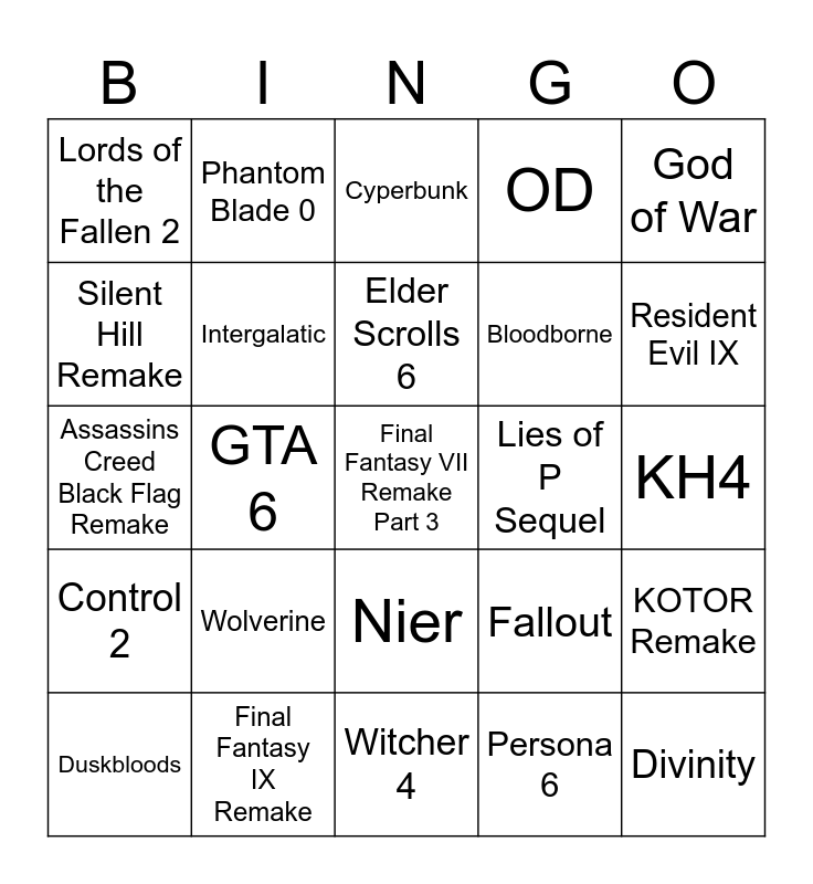 This bingo card has a free space and 24 words: Wolverine, Final Fantasy IX Remake, Elder Scrolls 6, Duskbloods, God of War, Lords of the Fallen 2, Silent Hill Remake, Phantom Blade 0, Lies of P Sequel, Nier, Bloodborne, Assassins Creed Black Flag Remake, Fallout, KOTOR Remake, Intergalatic, Persona 6, KH4, Cyperbunk, Resident Evil IX, GTA 6, Divinity, Control 2, OD and Witcher 4.