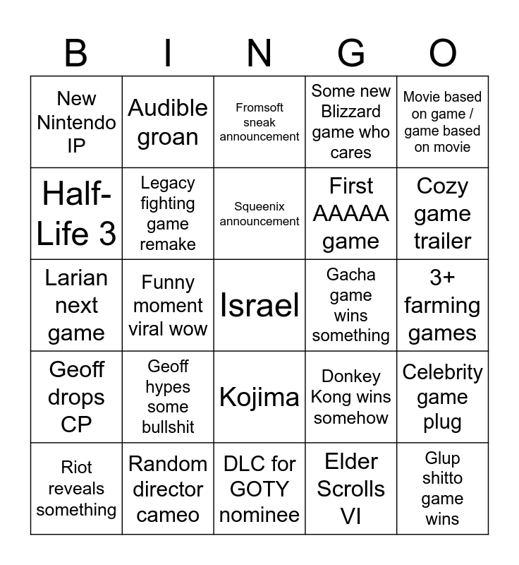 This bingo card has a free space and 24 words: Geoff hypes some bullshit, Random director cameo, Squeenix announcement, Riot reveals something, Movie based on game / game based on movie, New Nintendo IP, Half-Life 3, Audible groan, Gacha game wins something, Kojima, First AAAAA game, Larian next game, Donkey Kong wins somehow, Celebrity game plug, Legacy fighting game remake, Elder Scrolls VI, 3+ farming games, Fromsoft sneak announcement, Cozy game trailer, Funny moment viral wow, Glup shitto game wins, Geoff drops CP, Some new Blizzard game who cares and DLC for GOTY nominee.