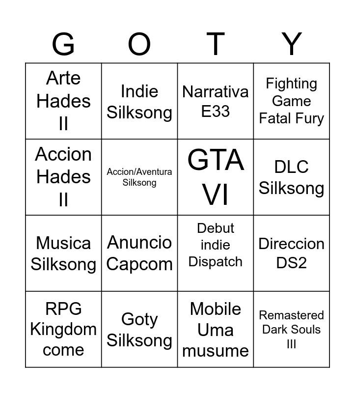 This bingo card has 16 words: Goty Silksong, Direccion DS2, Narrativa E33, Arte Hades II, Musica Silksong, Indie Silksong, Debut indie Dispatch, Mobile Uma musume, Accion Hades II, Accion/Aventura Silksong, RPG Kingdom come, Fighting Game Fatal Fury, Anuncio Capcom, DLC Silksong, GTA VI and Remastered Dark Souls III.