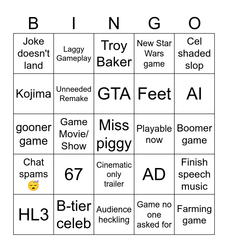 This bingo card has a free space and 24 words: 67, B-tier celeb, GTA, HL3, Cel shaded slop, Joke doesn't land, Kojima, Laggy Gameplay, Playable now, Cinematic only trailer, Feet, gooner game, AD, Finish speech music, Unneeded Remake, Game no one asked for, Boomer game, Troy Baker, AI, Game Movie/ Show, Farming game, Chat spams 😴, New Star Wars game and Audience heckling.