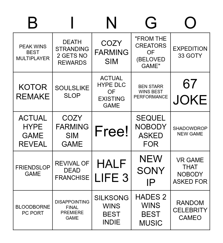 This bingo card has a free space and 34 words: NEW MOVIE/TV SHOW ABOUT A GAME, HADES 2 WINS BEST MUSIC, SCI-FI HORROR GAME, ARC RAIDERS WINS BEST MULTIPLAYER, FRIENDSLOP GAME, SOULSLIKE SLOP, EXPEDITION 33 GOTY, BLOODBORNE PC PORT, DEATH STRANDING 2 GETS NO REWARDS, KOJIMA NEW GAME, ACTUAL HYPE DLC OF EXISTING GAME, COZY FARMING SIM, ANIME GACHA GAME, MUPPETS, SEQUEL NOBODY ASKED FOR, 67 JOKE, DISAPPOINTING FINAL PREMIERE GAME, ACTUAL HYPE GAME REVEAL, REVIVAL OF DEAD FRANCHISE, NEW SONY IP, HALF LIFE 3, NEW FROMSOFT GAME/DLC, PEAK WINS BEST MULTIPLAYER, SHADOWDROP NEW GAME, SILKSONG WINS BEST INDIE, RANDOM CELEBRITY CAMEO, "FROM THE CREATORS OF (BELOVED GAME", ELDER SCROLLS VI, BEN STARR WINS BEST PERFORMANCE, KOTOR REMAKE, REMAKE/REMASTER OF RANDOM GAME, COZY FARMING SIM GAME, VR GAME THAT NOBODY ASKED FOR and NEW SONIC GAME.