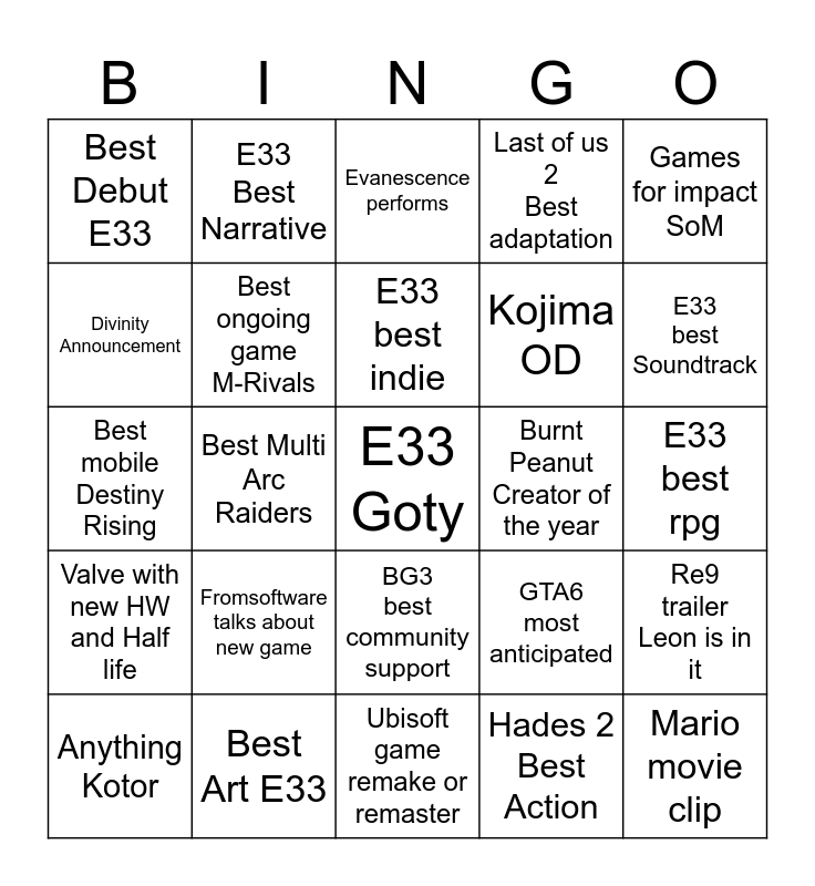 This bingo card has a free space and 24 words: Fromsoftware talks about new game, Best Art E33, E33 best indie, Anything Kotor, Games for impact SoM, Best Debut E33, Divinity Announcement, E33 Best Narrative, Burnt Peanut Creator of the year, BG3 best community support, Kojima OD, Best mobile Destiny Rising, GTA6 most anticipated, Re9 trailer Leon is in it, Best ongoing game M-Rivals, Hades 2 Best Action, E33 best rpg, Evanescence performs, E33 best Soundtrack, Best Multi Arc Raiders, Mario movie clip, Valve with new HW and Half life, Last of us 2 Best adaptation and Ubisoft game remake or remaster.