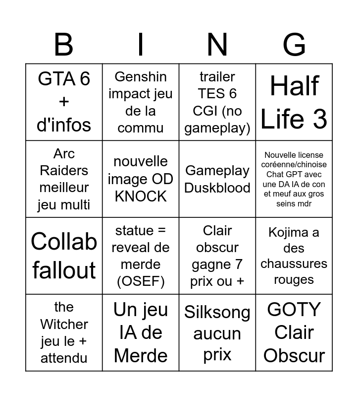 This bingo card has 16 words: Un jeu IA de Merde, Kojima a des chaussures rouges, trailer TES 6 CGI (no gameplay), GTA 6 + d'infos, Collab fallout, Genshin impact jeu de la commu, Clair obscur gagne 7 prix ou +, Silksong aucun prix, Arc Raiders meilleur jeu multi, nouvelle image OD KNOCK, the Witcher jeu le + attendu, Half Life 3, statue = reveal de merde (OSEF), Nouvelle license coréenne/chinoise Chat GPT avec une DA IA de con et meuf aux gros seins mdr, Gameplay Duskblood and GOTY Clair Obscur.
