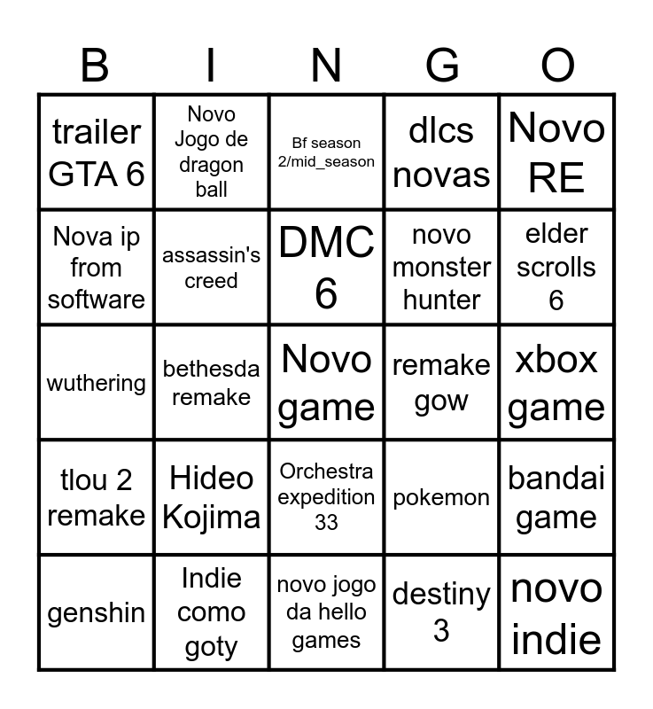 This bingo card has a free space and 24 words: Hideo Kojima, Indie como goty, DMC 6, genshin, Novo RE, trailer GTA 6, Nova ip from software, Novo Jogo de dragon ball, remake gow, Orchestra expedition 33, novo monster hunter, wuthering, pokemon, bandai game, assassin's creed, destiny 3, xbox game, Bf season 2/mid_season, elder scrolls 6, bethesda remake, novo indie, tlou 2 remake, dlcs novas and novo jogo da hello games.