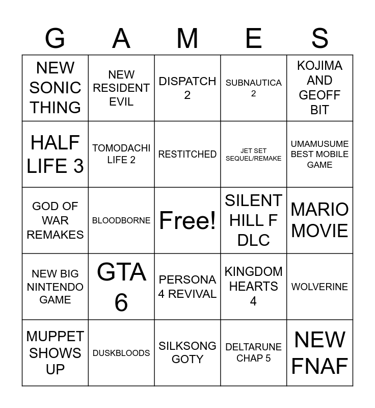 This bingo card has a free space and 24 words: GTA 6, DUSKBLOODS, RESTITCHED, MUPPET SHOWS UP, KOJIMA AND GEOFF BIT, NEW SONIC THING, HALF LIFE 3, NEW RESIDENT EVIL, SILENT HILL F DLC, PERSONA 4 REVIVAL, JET SET SEQUEL/REMAKE, GOD OF WAR REMAKES, KINGDOM HEARTS 4, WOLVERINE, TOMODACHI LIFE 2, DELTARUNE CHAP 5, MARIO MOVIE, DISPATCH 2, UMAMUSUME BEST MOBILE GAME, BLOODBORNE, NEW FNAF, NEW BIG NINTENDO GAME, SUBNAUTICA 2 and SILKSONG GOTY.