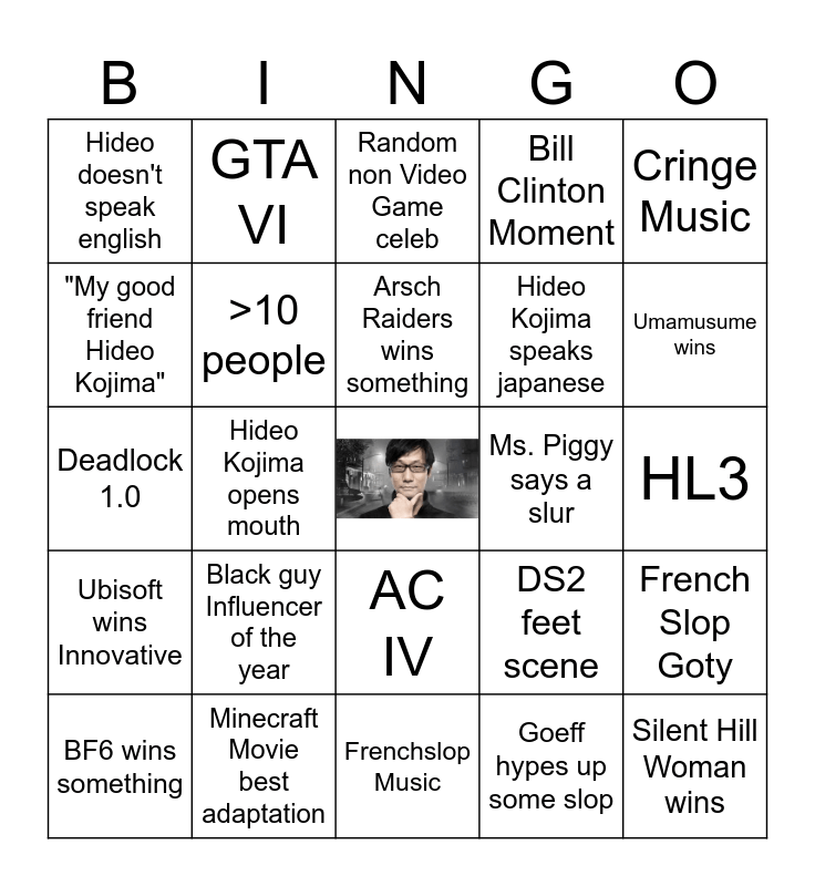 This bingo card has 1 images, a free space and 25 words: AC IV, Goeff hypes up some slop, Arsch Raiders wins something, Minecraft Movie best adaptation, Cringe Music, Hideo doesn't speak english, "My good friend Hideo Kojima", GTA VI, HL3, DS2 feet scene, Hideo Kojima speaks japanese, Deadlock 1.0, French Slop Goty, BF6 wins something, Hideo Kojima opens mouth, Gabe Newell, Bill Clinton Moment, Ubisoft wins Innovative, Random non Video Game celeb, Silent Hill Woman wins, Umamusume wins, Frenchslop Music, Ms. Piggy says a slur, Black guy Influencer of the year and >10 people.