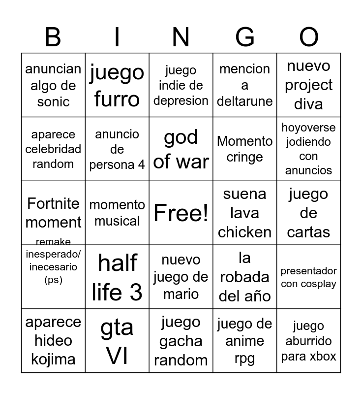 This bingo card has a free space and 24 words: half life 3, gta VI, god of war, aparece hideo kojima, nuevo project diva, anuncian algo de sonic, aparece celebridad random, juego furro, suena lava chicken, nuevo juego de mario, Momento cringe, Fortnite moment, la robada del año, presentador con cosplay, anuncio de persona 4, juego de anime rpg, juego de cartas, juego indie de depresion, hoyoverse jodiendo con anuncios, momento musical, juego aburrido para xbox, remake inesperado/ inecesario (ps), mencion a deltarune and juego gacha random.
