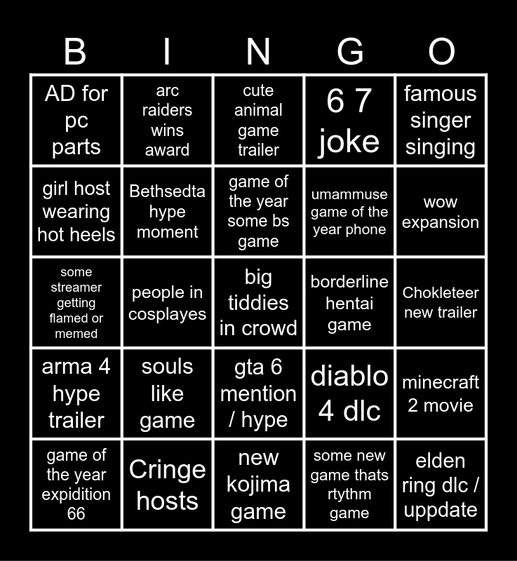 This bingo card has a free space and 24 words: souls like game, Cringe hosts, game of the year some bs game, game of the year expidition 66, famous singer singing, AD for pc parts, girl host wearing hot heels, arc raiders wins award, borderline hentai game, gta 6 mention / hype, umammuse game of the year phone, some streamer getting flamed or memed, diablo 4 dlc, minecraft 2 movie, Bethsedta hype moment, some new game thats rtythm game, Chokleteer new trailer, cute animal game trailer, wow expansion, people in cosplayes, elden ring dlc / uppdate, arma 4 hype trailer, 6 7 joke and new kojima game.