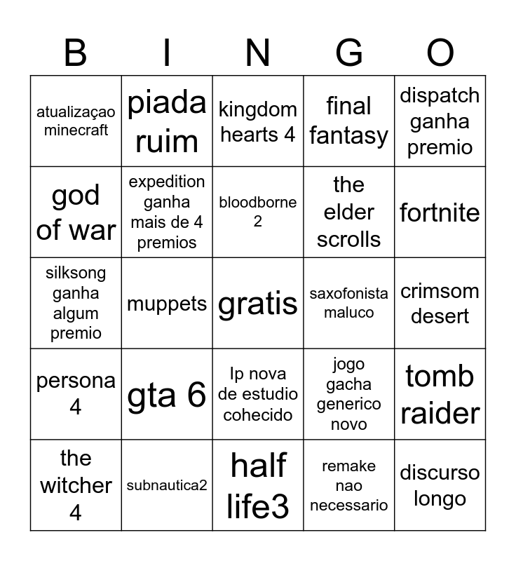 This bingo card has a free space and 24 words: gta 6, subnautica2, bloodborne 2, the witcher 4, dispatch ganha premio, atualizaçao minecraft, god of war, piada ruim, saxofonista maluco, Ip nova de estudio cohecido, the elder scrolls, silksong ganha algum premio, jogo gacha generico novo, tomb raider, expedition ganha mais de 4 premios, remake nao necessario, crimsom desert, kingdom hearts 4, fortnite, muppets, discurso longo, persona 4, final fantasy and half life3.