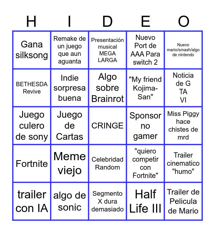 This bingo card has a free space and 24 words: Meme viejo, algo de sonic, Algo sobre Brainrot, trailer con IA, Nuevo mario/smash/algo de nintendo, Gana silksong, BETHESDA Revive, Remake de un juego que aun aguanta, Sponsor no gamer, Celebridad Random, "My friend Kojima-San", Juego culero de sony, "quiero competir con Fortnite", Trailer cinematico "humo", Indie sorpresa buena, Half Life III, Miss Piggy hace chistes de mrd, Presentación musical MEGA LARGA, Noticia de GTA VI, Juego de Cartas, Trailer de Pelicula de Mario, Fortnite, Nuevo Port de AAA Para switch 2 and Segmento X dura demasiado.