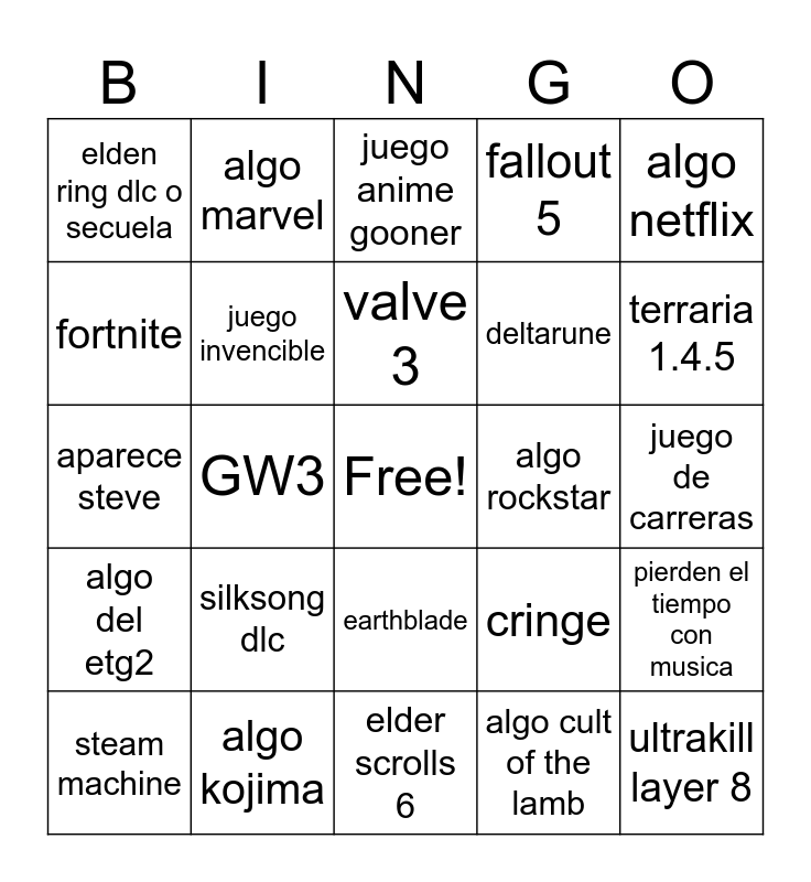 This bingo card has a free space and 24 words: silksong dlc, algo kojima, valve 3, steam machine, algo netflix, elden ring dlc o secuela, fortnite, algo marvel, algo rockstar, earthblade, deltarune, aparece steve, cringe, pierden el tiempo con musica, juego invencible, algo cult of the lamb, juego de carreras, juego anime gooner, terraria 1.4.5, GW3, ultrakill layer 8, algo del etg2, fallout 5 and elder scrolls 6.