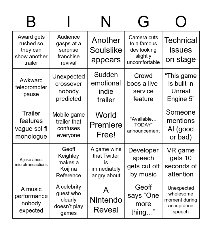 This bingo card has a free space and 24 words: Geoff Keighley makes a Koijma Reference, A celebrity guest who clearly doesn’t play games, Sudden emotional indie trailer, A music performance nobody expected, Technical issues on stage, Award gets rushed so they can show another trailer, Awkward teleprompter pause, Audience gasps at a surprise franchise revival, “Available… TODAY” announcement, A game wins that Twitter is immediately angry about, Crowd boos a live-service feature, Trailer features vague sci-fi monologue, Developer speech gets cut off by music, VR game gets 10 seconds of attention, Unexpected crossover nobody predicted, Geoff says “One more thing…”, Someone mentions AI (good or bad), Another Soulslike appears, “This game is built in Unreal Engine 5”, Mobile game trailer that confuses everyone, Unexpected wholesome moment during acceptance speech, A joke about microtransactions, Camera cuts to a famous dev looking slightly uncomfortable and A Nintendo Reveal.
