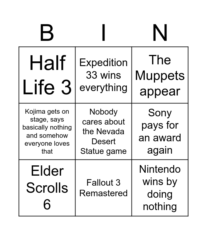 This bingo card has 9 words: Elder Scrolls 6, The Muppets appear, Expedition 33 wins everything, Kojima gets on stage, says basically nothing and somehow everyone loves that, Half Life 3, Sony pays for an award again, Nobody cares about the Nevada Desert Statue game, Nintendo wins by doing nothing and Fallout 3 Remastered.