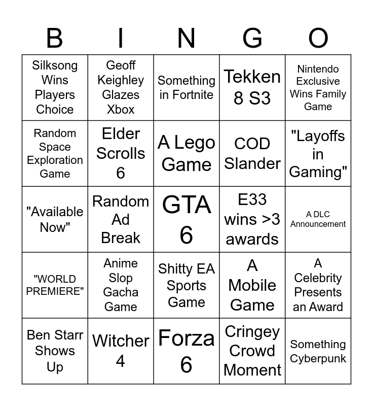 This bingo card has a free space and 24 words: Anime Slop Gacha Game, Witcher 4, A Lego Game, Ben Starr Shows Up, Nintendo Exclusive Wins Family Game, Silksong Wins Players Choice, Random Space Exploration Game, Geoff Keighley Glazes Xbox, E33 wins >3 awards, Shitty EA Sports Game, COD Slander, "Available Now", A Mobile Game, A Celebrity Presents an Award, Elder Scrolls 6, Cringey Crowd Moment, A DLC Announcement, Something in Fortnite, "Layoffs in Gaming", Random Ad Break, Something Cyberpunk, "WORLD PREMIERE", Tekken 8 S3 and Forza 6.
