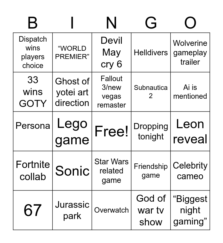 This bingo card has a free space and 24 words: Sonic, Jurassic park, Fallout 3/new vegas remaster, 67, Wolverine gameplay trailer, Dispatch wins players choice, 33 wins GOTY, “WORLD PREMIER”, Dropping tonight, Star Wars related game, Subnautica 2, Persona, Friendship game, Celebrity cameo, Ghost of yotei art direction, God of war tv show, Leon reveal, Devil May cry 6, Ai is mentioned, Lego game, “Biggest night gaming”, Fortnite collab, Helldivers and Overwatch.